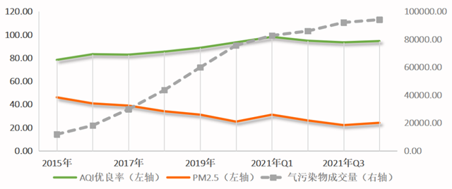 從環(huán)境改善情況來看,水污染物成交量(由化學(xué)需氧量和氨氮成交量構(gòu)成)與III類水質(zhì)以上省控?cái)嗝姹壤琅f呈高度正相關(guān)關(guān)系,顯著性水平小于0.01,皮爾遜相關(guān)系數(shù)為0.942。氣污染物成交量(由二氧化硫和氮氧化物成交量構(gòu)成)與浙江省AQI優(yōu)良率呈高度正相關(guān)關(guān)系,顯著性水平小于0.01,皮爾遜相關(guān)系數(shù)為0.953;氣污染物成交量與PM2.5指數(shù)呈高度負(fù)相關(guān)關(guān)系,顯著性水平小于0.01,皮爾遜相關(guān)系數(shù)為-0.957。