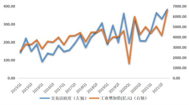 從工業(yè)經(jīng)濟(jì)指標(biāo)來看,浙江省排污權(quán)交易活躍度與工業(yè)增加值(采用全省規(guī)模以上工業(yè)增加值各季度增加值,非累計(jì)計(jì)算數(shù))近一年整體也呈正相關(guān)走勢(shì)顯著性水平小于0.05,皮爾遜相關(guān)系數(shù)為0.721。