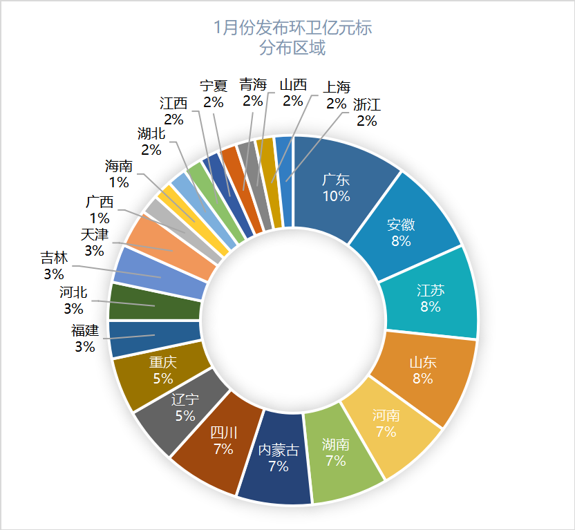 1月份已發(fā)布的60個環(huán)衛(wèi)億元標分布于23個省份,其中廣東、安徽、江蘇、山東、河南、湖南、內(nèi)蒙古、四川發(fā)布項目37個,占比超過60%。