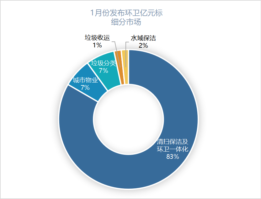 1月份已發(fā)布的60個環(huán)衛(wèi)億元標涉及“清掃保潔及環(huán)衛(wèi)一體化、城市物業(yè)、垃圾分類、垃圾收運、及水域保潔”等五個細分市場。