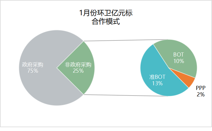 1月份已發(fā)布的60個環(huán)衛(wèi)億元標,其中采取政府采購模式的項目有45個,采取非政府采購模式的為15個,非政府采購項目占比25%。