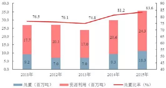 2011-2015年中國工業(yè)危險廢物處理情況