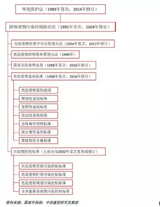 與危廢管理相關的法律包括:《環(huán)保法》、《固體廢物污染環(huán)境防治法》、《可再生能源法》、《節(jié)約能源法》、《循環(huán)經濟促進法》、《清潔生產促進法》。除《環(huán)保法》和《固體廢物污染環(huán)境防治法》外其他法律都是在2004年后頒布,《環(huán)保法》修訂已于2014年4月完成,2015年起執(zhí)行。