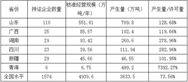 據各省市環(huán)保廳最新數(shù)據統(tǒng)計顯示,全國持有危廢處理許可證企業(yè)數(shù)近1600家,核準經營規(guī)模約4900萬噸/年。根據環(huán)保部數(shù)據統(tǒng)計,2014年度全國危廢產生量為3633.5萬噸。全國平均供給水平在70%多,即產生量除以核準經營規(guī)模在70%多的水平,但區(qū)域之間存在較大差異,低于50%的省份有 8個,多為經濟相對發(fā)達區(qū)域,危廢產生量超過核準經營規(guī)模的省份有6個。下圖是危廢產生量超出核準經營規(guī)模的省份: