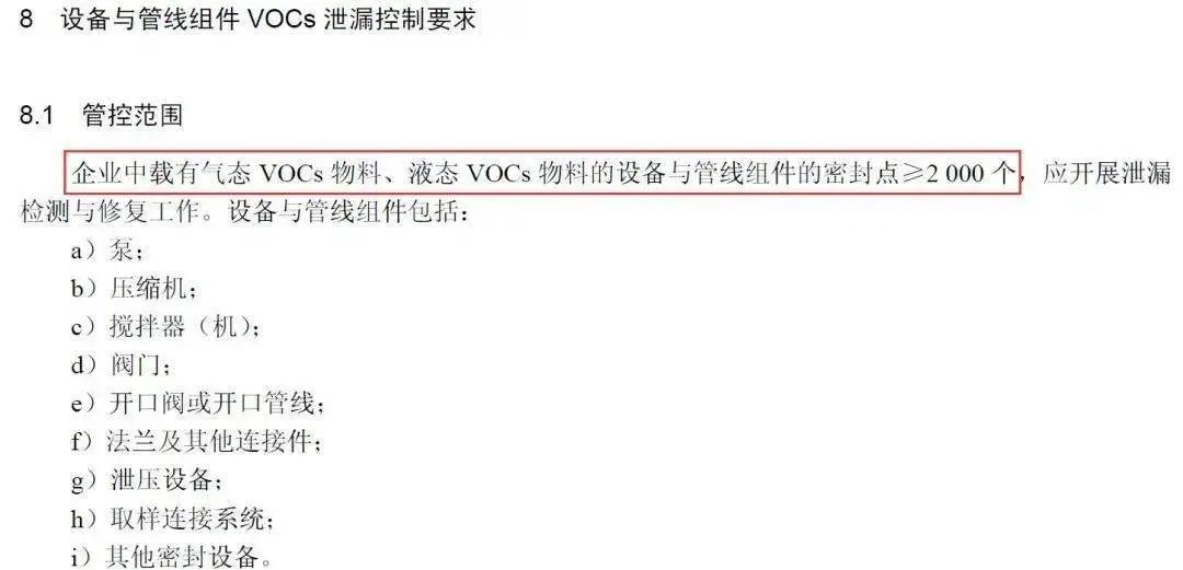 即對于企業(yè)中載有氣態(tài)VOCs物料、液態(tài)VOCs物料的設備與管線組件密封點小于2000個的,不強制開展泄露檢測與修復工作。