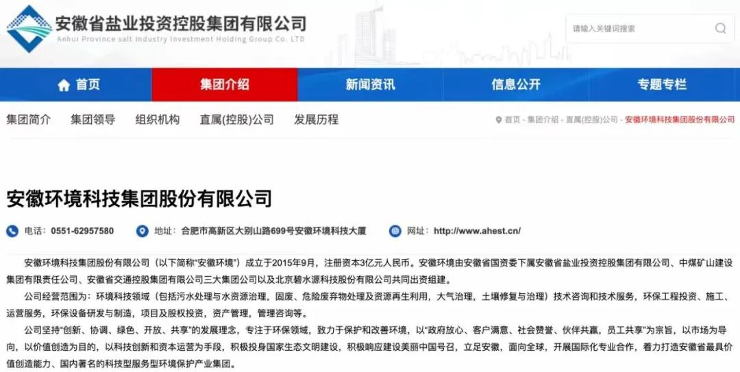 2015年9月,安徽鹽業(yè)集團成立安徽環(huán)境科技集團股份有限公司(簡稱“安徽環(huán)境”),注冊資本3億元人民幣。