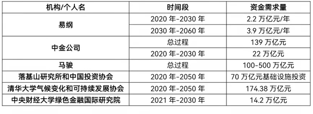 我國(guó)制定2030年前碳排放達(dá)峰行動(dòng)方案,重點(diǎn)在于優(yōu)化產(chǎn)業(yè)結(jié)構(gòu)和能源結(jié)構(gòu),實(shí)施金融支持綠色低碳發(fā)展專項(xiàng)政策,設(shè)立碳減排支持工具。目前,我國(guó)重點(diǎn)用能行業(yè)綠色低碳轉(zhuǎn)型地資金需求規(guī)模大依然較大,國(guó)內(nèi)多家機(jī)構(gòu)及領(lǐng)導(dǎo)、專家對(duì)于實(shí)現(xiàn)雙碳目標(biāo)期間的投資需求資金量也做出相關(guān)預(yù)測(cè):