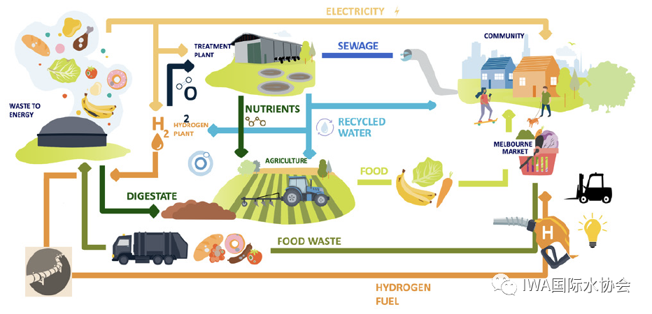 第二個例子是墨爾本的亞拉河谷水務(wù)公司(Yarra Valley Water)。他們成功召集了一個團隊在墨爾本北郊的Aurora污水廠開展一個制氫項目。該團隊除了水務(wù)公司,還有希望實現(xiàn)碳減排的租戶、希望擴大制氫設(shè)備規(guī)模的技術(shù)供應(yīng)商,以及尋求去碳化的供氣公司。項目的水源是污水廠多余的再生水,以及附近一個垃圾發(fā)電廠的剩余可再生能源。