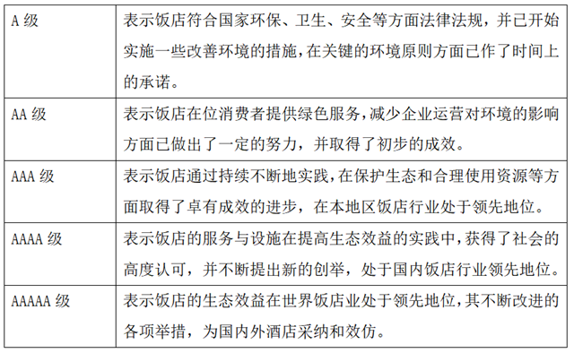 我國(guó)于2007年發(fā)布了《綠色飯店等級(jí)評(píng)定規(guī)定》,根據(jù)企業(yè)在提供綠色服務(wù)、保護(hù)環(huán)境等方面做出的努力將綠色酒店分為五個(gè)等級(jí),具體內(nèi)容如下。