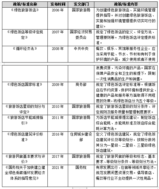 近年來(lái),隨著我國(guó)綠色低碳發(fā)展意識(shí)的不斷提高以及碳達(dá)峰、碳中和目標(biāo)的提出,相關(guān)部門(mén)出臺(tái)了一系列有關(guān)綠色飯店的相關(guān)政策及標(biāo)準(zhǔn)。2006年,我國(guó)首次發(fā)布《綠色旅游飯店》標(biāo)準(zhǔn),規(guī)定了創(chuàng)建綠色旅游飯店、實(shí)施和改進(jìn)環(huán)境管理的要求。在此之后,我國(guó)相繼出臺(tái)了有關(guān)綠色酒店的標(biāo)準(zhǔn),如《綠色飯店等級(jí)評(píng)定規(guī)定》、《綠色飯店國(guó)家標(biāo)準(zhǔn)》、《綠色飯店建筑評(píng)價(jià)標(biāo)準(zhǔn)》等。2021年2月,國(guó)務(wù)院印發(fā)《國(guó)務(wù)院關(guān)于加快建立健全綠色低碳循環(huán)發(fā)展經(jīng)濟(jì)體系的指導(dǎo)意見(jiàn)》,指出我國(guó)需有序發(fā)展出行、住宿等領(lǐng)域共享經(jīng)濟(jì),規(guī)范發(fā)展閑置資源交易。我國(guó)需倡導(dǎo)酒店、餐飲等行業(yè)不主動(dòng)提供一次性用品?!兑庖?jiàn)》的印發(fā)進(jìn)一步強(qiáng)調(diào)了我國(guó)酒店住宿行業(yè)綠色低碳發(fā)展的重要性及必要性。住宿作為人們出行必不可少的環(huán)節(jié),酒店住宿行業(yè)綠色低碳轉(zhuǎn)型是減少我國(guó)旅游業(yè)碳排放的重要因素。