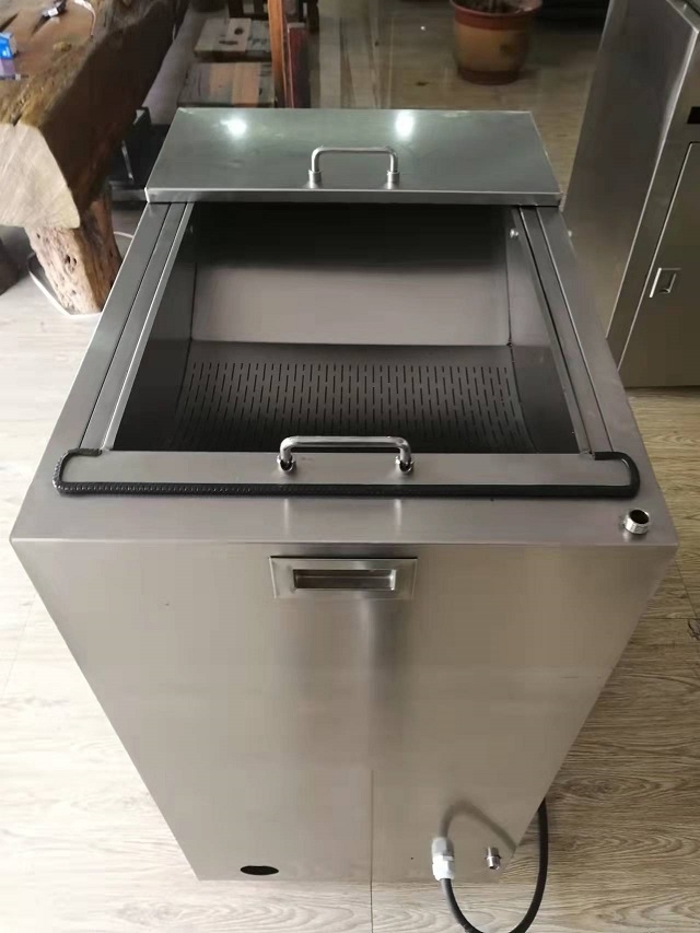 據(jù)介紹,餐廚垃圾綜合處理一體機(jī)由機(jī)體、固液分離料斗、油水分離構(gòu)、粉碎研磨機(jī)構(gòu)、配電箱等組成。餐廚垃圾先經(jīng)過(guò)固液分離程序,分為固態(tài)材料和液體兩部分;隨后,固態(tài)材料通過(guò)粉碎研磨排入垃圾桶,液體通過(guò)油水分離被分成污水、廢油兩部分。