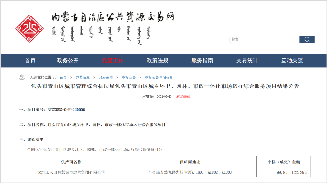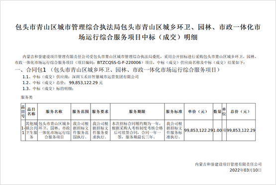 內(nèi)蒙古自治區(qū)政府采購網(wǎng)、內(nèi)蒙古自治區(qū)公共資源交易網(wǎng)消息,2022年3月10日,包頭市青山區(qū)城鄉(xiāng)環(huán)衛(wèi)、園林、市政一體化市場運(yùn)行綜合服務(wù)項(xiàng)目開標(biāo)。