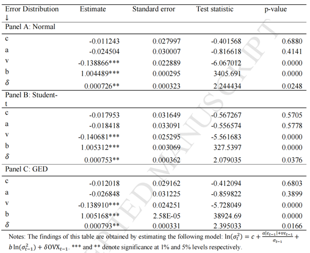 使用EGARCH模型考察原油市場波動對EUA市場影響時,發(fā)現(xiàn)在正態(tài)分布、t分布、GED分布三種假設(shè)下,OVX的系數(shù)全部顯著為正,表示原油價格波動的上升會導(dǎo)致EUA市場波動的增加,引起排放價格下降。