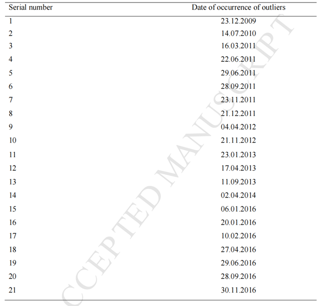 EUA市場(chǎng)回報(bào)率序列中的離群值如圖3所列,觀察對(duì)應(yīng)時(shí)期特點(diǎn)得到,離群值可能受戰(zhàn)爭(zhēng)、自然災(zāi)害、政治沖突、經(jīng)濟(jì)崩潰等事件影響造成。