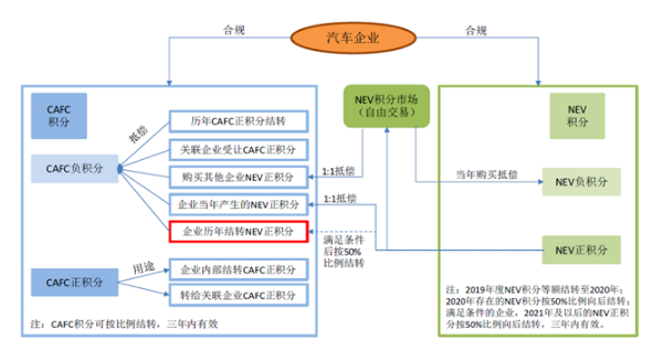 結轉與交易。根據《乘用車汽車平均燃料消耗量與新能源汽車積分并行管理辦法》的規(guī)定,CAFC正積分只能結轉留待后續(xù)年份使用或轉讓給關聯企業(yè)用于抵償其負積分,但不能用于NEV負積分的抵償,也無法自由轉讓給其他車企。NEV正積分可以抵扣同等數量的CAFC負積分,也可以在不同企業(yè)間進行自由的轉讓交易后抵償其他企業(yè)的負積分,但不得結轉至后續(xù)年份(2019年除外,該年度產生的新能源汽車正積分可以等額結轉一年)。乘用車企業(yè)平均燃料消耗量正積分結轉后續(xù)年度使用的,按照一定比例進行結轉,結轉有效期不超過三年。2018年度及以前年度的正積分,每結轉一次,結轉比例為80%;2019年度及以后年度的正積分,每結轉一次,結轉比例為90%。