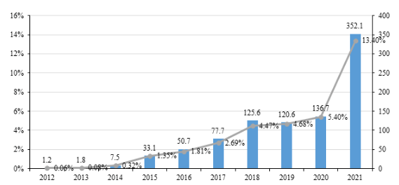 圖7:2012-2021中國新能源汽車銷量及滲透率