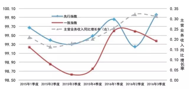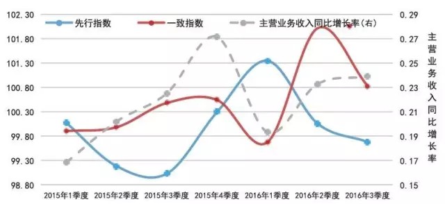 2015 年1季度-2016年3季度A股環(huán)保上市企業(yè)數(shù)據(jù)測算結果顯示:一致指數(shù)與A股環(huán)保上市企業(yè)主營業(yè)務收入增長率的變化趨勢基本吻合(如圖3所示),先行指 數(shù)的先行特征顯著,驗證了EICI指標體系的有效性。此外,對先行指數(shù)進行的周期性檢驗結果表明,主營環(huán)保上市企業(yè)的先行指數(shù)的領先周期在2015年度為 2個季度、在2016年度為1個季度(如圖4所示),該結果表現(xiàn)出環(huán)保產業(yè)的經濟敏感度有所提高,即先行指數(shù)結果可用于對環(huán)保產業(yè)未來1個季度的走勢進行 預判。
