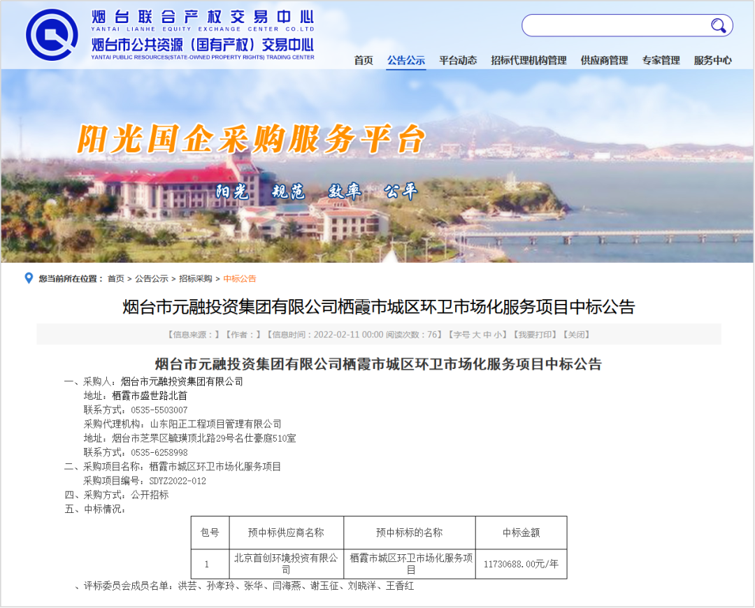 煙臺(tái)市公共資源(國(guó)有產(chǎn)權(quán))交易中心消息,2022年2月11日,煙臺(tái)市元融投資集團(tuán)有限公司棲霞市城區(qū)環(huán)衛(wèi)市場(chǎng)化服務(wù)項(xiàng)目開標(biāo),中標(biāo)結(jié)果如下: