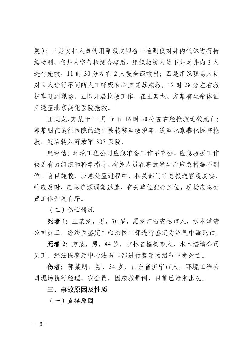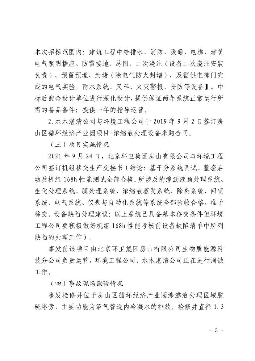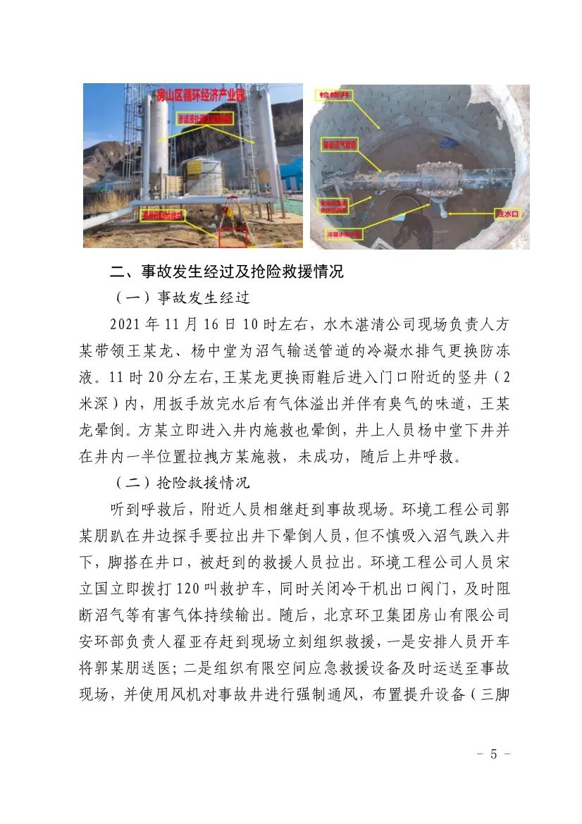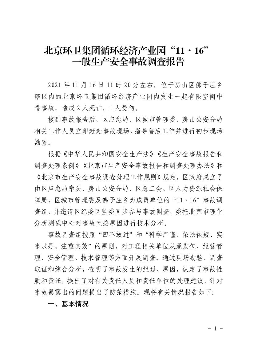 日前,北京市應(yīng)急管理局公布北京環(huán)衛(wèi)集團(tuán)循環(huán)經(jīng)濟(jì)產(chǎn)業(yè)園“11·16”一般生產(chǎn)安全事故調(diào)查報告。報告顯示,2021年11月16日,位于房山區(qū)佛子莊鄉(xiāng)的北京環(huán)衛(wèi)集團(tuán)循環(huán)經(jīng)濟(jì)產(chǎn)業(yè)園內(nèi)發(fā)生一起有限空間中毒事故,造成2人死亡,1人受傷。