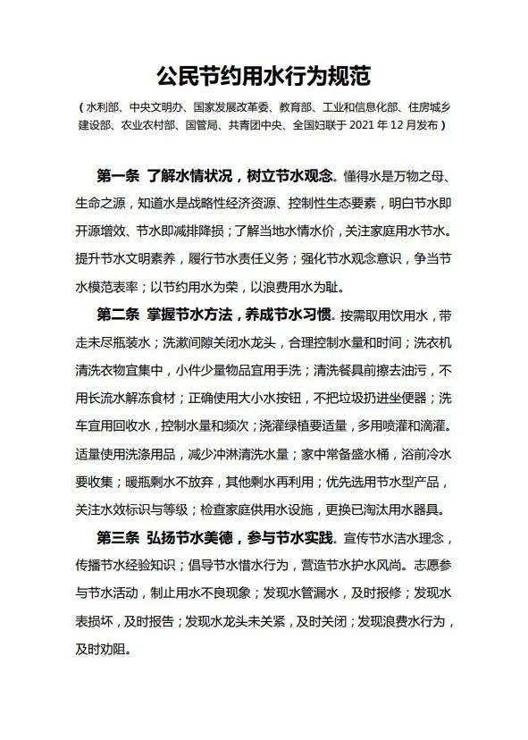 三是積極踐行水利部、中央文明辦等 10 部門(mén)聯(lián)合發(fā)布的《公民節(jié)約用水行 為規(guī)范》。用自己的文明言行勸導(dǎo)、糾正身邊的不良行為,形成節(jié)水的新常態(tài)。