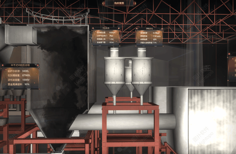 煙氣凈化系統(tǒng)是組合了半干式反應(yīng)塔、活性炭定量裝置、布袋式除塵器這三個步驟的系統(tǒng)。HT 通過對垃圾在焚燒所產(chǎn)生的煙氣、煙氣處理系統(tǒng)、凈化后通過煙囪排入大氣等過程對煙氣進行虛擬仿真,在場景內(nèi)模擬煙氣凈化過程。煙氣經(jīng)過余熱鍋爐放出熱量后進入噴霧吸收反應(yīng)塔。