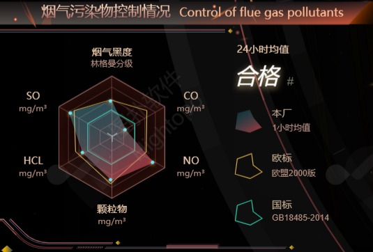 HT 左側(cè)面板循環(huán)播放煙氣污染物控制情況、二噁英消除率、以及安全生產(chǎn)關(guān)鍵指標等。