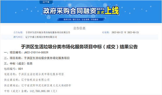 遼寧省政府采購網(wǎng)消息,2022年3月22日,沈陽市于洪區(qū)生活垃圾分類市場化服務(wù)項目公布開標(biāo)結(jié)果,成交價1.4276億元。
