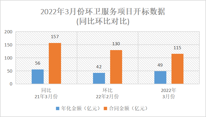 受疫情影響,三月份全國(guó)范圍環(huán)衛(wèi)服務(wù)項(xiàng)目大面積暫停招標(biāo)或推遲開(kāi)標(biāo),與去年同期(同比)及今年二月份(環(huán)比)相比,環(huán)衛(wèi)服務(wù)項(xiàng)目成交年化額及合同額均出現(xiàn)不同程度下降。