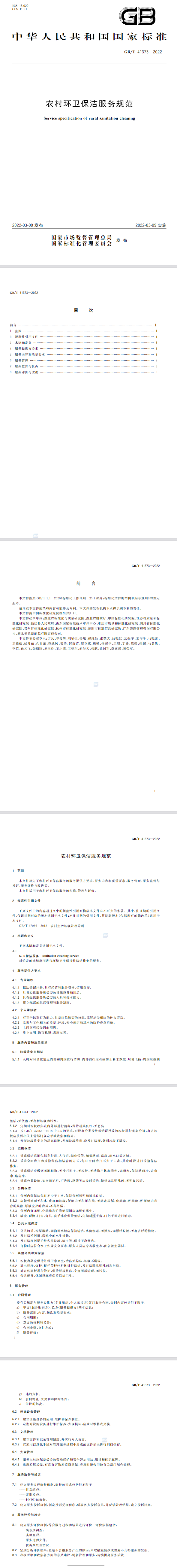 日前,國家市場監(jiān)督管理總局、中國國家標準化管理委員會聯(lián)合編制的《農(nóng)村環(huán)衛(wèi)保潔服務(wù)規(guī)范》(GB/T 41373-2022)發(fā)布,并于2022年3月9日正式施行。