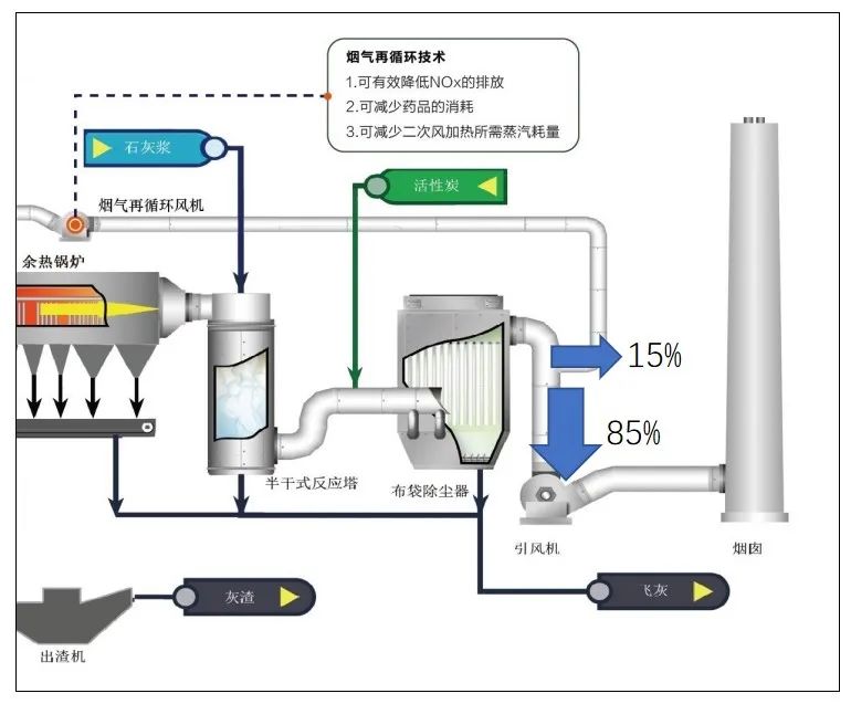 目前能夠滿足《生活垃圾污染控制標準》(GB18485-2014)和歐盟EU2010/75/EC排放標準的煙氣凈化處理工藝以“SNCR+半干法+干法+活性炭+袋式除塵”和“SNCR+半干法+干法+活性炭+袋式除塵+濕法”為主。但部分省市對NOx的排放標準提出了更高的要求,如DB37/2376-2013山東省區(qū)域性大氣污染物綜合排放標準的重點控制區(qū)域NOx限值為100mg/m3,垃圾焚燒煙氣NOx排放濃度限值低于100mg/m3成了一個趨勢。部分焚燒項目因此增加了SCR工藝以適應(yīng)更高的環(huán)保要求。主流的脫硝技術(shù)包括焚燒爐燃燒控制爐溫、煙氣再循環(huán)技術(shù)、SNCR系統(tǒng)、SCR系統(tǒng)以及ICR(PNCR)系統(tǒng),其中焚燒爐燃燒控制爐溫與煙氣回流技術(shù)可有效降低原始NOx濃度。但通常采用焚燒爐燃燒控制爐溫、煙氣回流以及SNCR脫硝系統(tǒng)的情況下,NOx排放值仍無法穩(wěn)定控制在100mg/m3以內(nèi)。針對NOx排放限值為100mg/m3的垃圾焚燒項目,目前國內(nèi)垃圾焚燒發(fā)電廠采用的脫硝工藝有SNCR+SCR系統(tǒng)以及SNCR+ICR(PNCR)系統(tǒng)。從上海環(huán)境洛陽項目應(yīng)用組合“煙氣再循環(huán)+SNCR+ICR(PNCR)”脫硝工藝后運行工況穩(wěn)定性較好,綜合成本更低。對于原先未采用煙氣再循環(huán)工藝的焚燒廠,如在引風(fēng)機前增加煙氣再循環(huán)工藝,可有效降低引風(fēng)機的電功率,利用再循環(huán)風(fēng)替代原有二次風(fēng),可實現(xiàn)引風(fēng)機的運行功率降低約10%。而且,應(yīng)用煙氣再循環(huán)工藝后,爐內(nèi)過量空氣系數(shù)降低,焚燒爐出口NOx原始濃度可降低約30%-40%,穩(wěn)定控制在200mg/Nm3以內(nèi),入爐噸垃圾尿素消耗量可節(jié)約0.5kg左右,降低系統(tǒng)運行的能耗和藥劑消耗,實現(xiàn)碳減排。