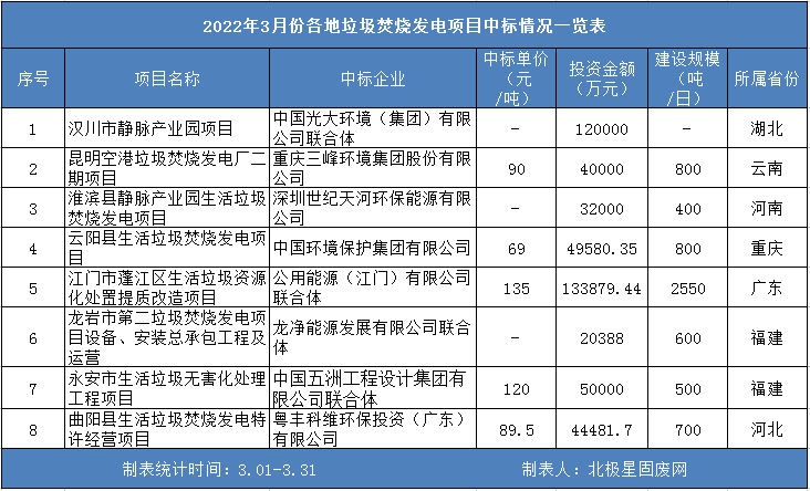 陽(yáng)春三月已過(guò),3月垃圾焚燒發(fā)電項(xiàng)目的開(kāi)標(biāo)目數(shù)量與1、2月開(kāi)標(biāo)數(shù)量總和持平,累計(jì)開(kāi)標(biāo)8個(gè)項(xiàng)目,基于公開(kāi)的項(xiàng)目信息,8個(gè)項(xiàng)目涉及總投資約49億人民幣,垃圾處理費(fèi)平均單價(jià)為100元/噸,預(yù)計(jì)新增垃圾焚燒處理產(chǎn)能超6350噸/日。同時(shí),3月開(kāi)標(biāo)的8個(gè)項(xiàng)目個(gè)個(gè)看點(diǎn)十足。
