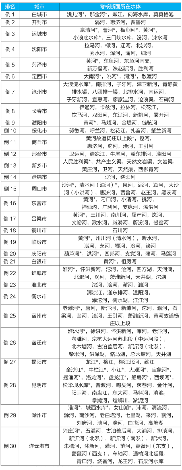 水環(huán)境質(zhì)量狀況排名后30位城市及所在水體
