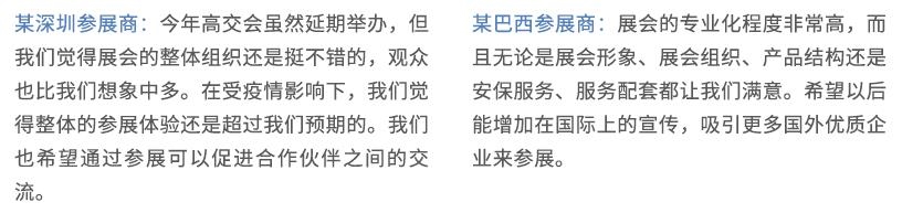 作為疫情防控常態(tài)化下舉辦的科技盛會(huì),2021年高交會(huì)總面積達(dá)15.85萬(wàn)平方米,線下11個(gè)、線上26個(gè)國(guó)家和國(guó)際組織,共56個(gè)團(tuán)組參展本屆高交會(huì)。天津、山東等9家省市展團(tuán),清華大學(xué)、北京大學(xué)等14所高校團(tuán)組精心組織眾多科研成果進(jìn)行展示,經(jīng)專家評(píng)審,120家單位獲優(yōu)秀組織獎(jiǎng),81家單位獲優(yōu)秀展示獎(jiǎng),599個(gè)項(xiàng)目獲優(yōu)秀產(chǎn)品獎(jiǎng),共有4164家展商亮相線下展會(huì)和線上展會(huì),共舉辦各類高層次論壇、專業(yè)技術(shù)論壇、行業(yè)沙龍等活動(dòng)73場(chǎng),近15萬(wàn)人次觀眾現(xiàn)場(chǎng)參觀了大會(huì),有129家海內(nèi)外媒體的超過(guò)500多名記者參與了本屆高交會(huì)的報(bào)道。大會(huì)委托的第三方調(diào)研公司對(duì)第二十三屆高交會(huì)參展商的現(xiàn)場(chǎng)調(diào)查數(shù)據(jù)(見下圖)。
