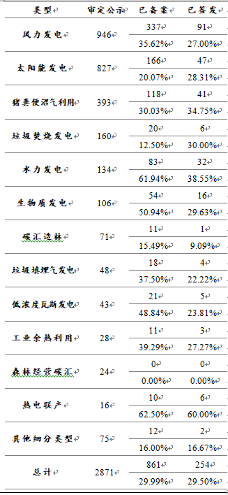CCER審批2013年啟動,當(dāng)年提交審定的51個(gè)項(xiàng)目中,已有36個(gè)完成減排量簽發(fā)。2017年提交審定的164個(gè)項(xiàng)目則全部處于審定公示狀態(tài)。而從備案來看,2014年完成審定并提交備案申請的項(xiàng)目共有140個(gè),139個(gè)成功獲得備案,其中的100個(gè)獲得減排量簽發(fā)。