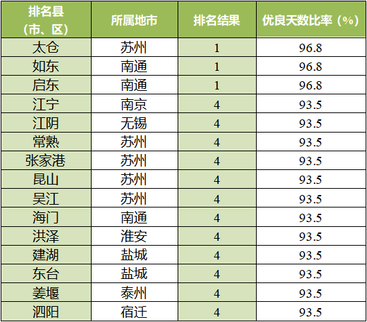 優(yōu)良天數(shù)比率相對較好的前10位(1-10名)依次是:太倉(如東、啟東并列)、江寧(江陰、常熟、張家港、昆山、吳江、海門、洪澤、建湖、東臺、姜堰、泗陽并列)