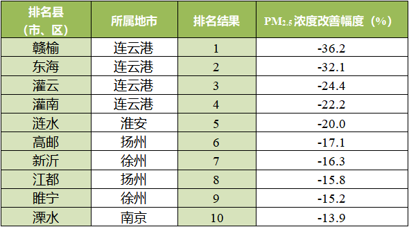 PM2.5濃度改善幅度相對較好的前10位(1-10名)依次是:贛榆、東海、灌云、灌南、漣水、高郵、新沂、江都、睢寧、溧水