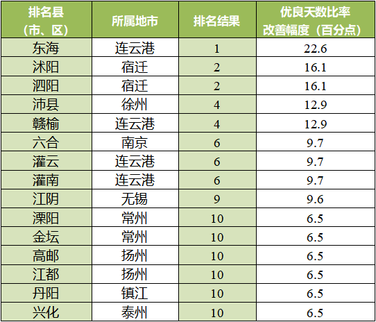 優(yōu)良天數(shù)比率改善幅度相對較好的前10位(1-10名)依次是:東海、沭陽(泗陽并列)、沛縣(贛榆并列)、六合(灌云、灌南并列)、江陰、溧陽(金壇、高郵、江都、丹陽、興化并列)