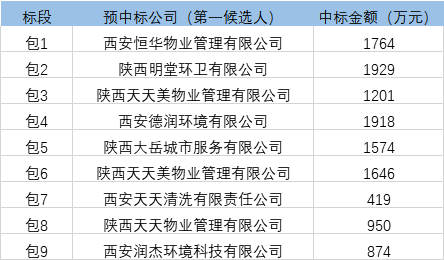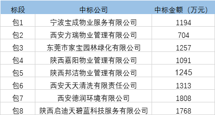 近日,西安市碑林區(qū)、未央?yún)^(qū)兩大億級環(huán)衛(wèi)項(xiàng)目先后開標(biāo)。兩項(xiàng)目共17個(gè)標(biāo)包,最大包金額1929萬元,最小標(biāo)金額為704萬元。除了東莞家寶園林和寧波寶成物業(yè)各中一標(biāo)外,另15個(gè)標(biāo)包分別被15家陜西省企業(yè)獲得。具體如下表: