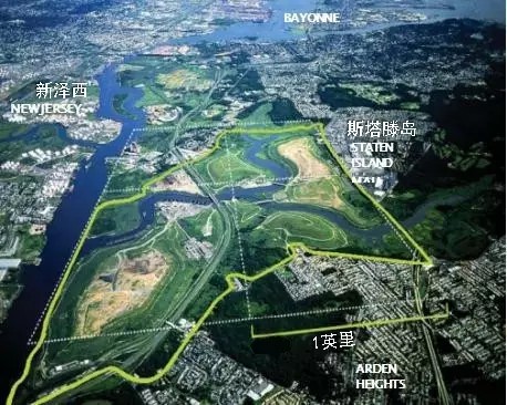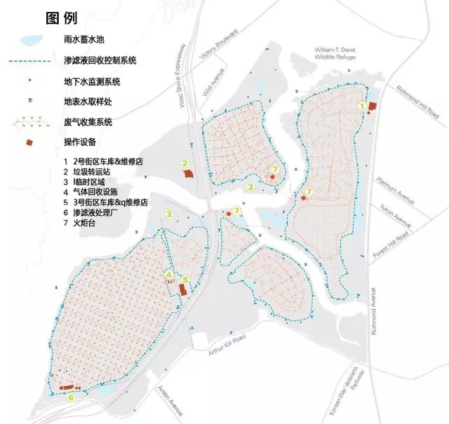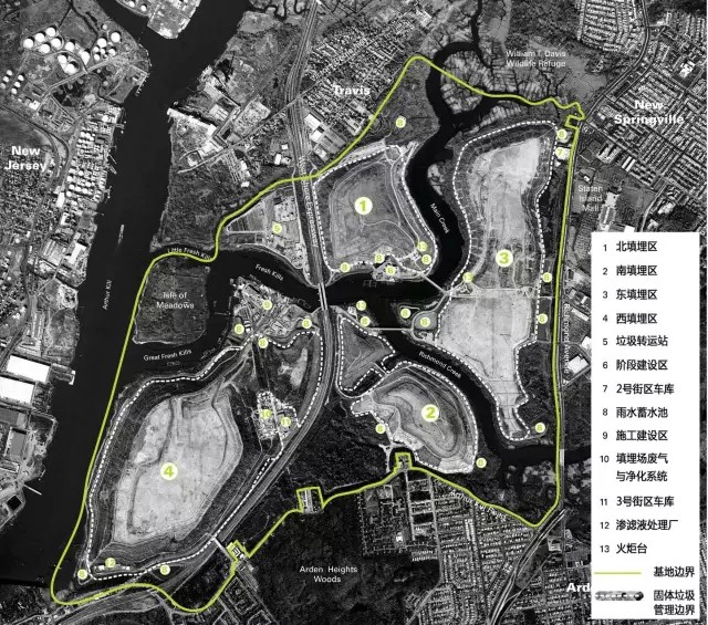 弗萊士河垃圾填埋場位于紐約斯塔滕島(圖3),占地面積超過2200英畝(約8.9k㎡),于1948年投入運營,2001年停止接收垃圾。這里曾經(jīng)是世界上最大的垃圾填埋場,也是1990年代紐約市唯一仍在使用的填埋場。隨著1999年弗萊士河更新計劃的啟動,原有填埋場區(qū)陸續(xù)關(guān)閉并封場,直至2001年,填埋場接收了最后一批垃圾——“9?11”事件的世貿(mào)中心建筑廢墟。