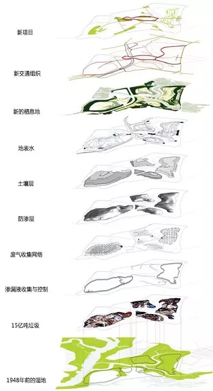 環(huán)境修復與垃圾防滲是弗萊士河公園改造初期的關(guān)鍵任務,其中運用了多層覆蓋技術(shù),收集廢棄物產(chǎn)生的氣體、滲漏液的系統(tǒng)和水質(zhì)檢測系統(tǒng)(圖7,圖8)。場地生態(tài)修復需達到嚴格的標準后方允許啟動各類建設項目。