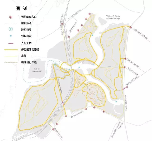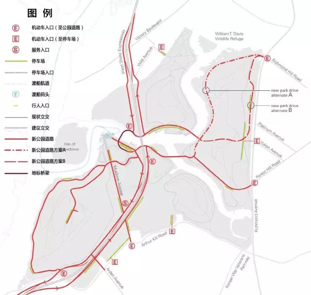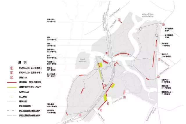 (5)在生態(tài)敏感度允許條件下優(yōu)化交通網(wǎng)絡,提升公園在紐約市域及區(qū)域范圍內(nèi)的可達性;