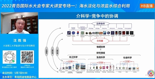 大連理工大學(xué)能源與動(dòng)力學(xué)院沈勝強(qiáng)教授帶來了主題為《“雙碳”背景下海水淡化技術(shù)的發(fā)展與創(chuàng)新》的分享,詳解了海水淡化與“雙碳”目標(biāo)實(shí)現(xiàn)的相關(guān)性。沈勝強(qiáng)教授提到,降低能源消耗是海水淡化技術(shù)發(fā)展的主要方向,節(jié)能途徑包括廢熱利用、能效提高、新能源利用等,并以多效蒸發(fā)為例進(jìn)行了熱傳遞過程分析,甚至提到了更深層次的介科學(xué)理論。