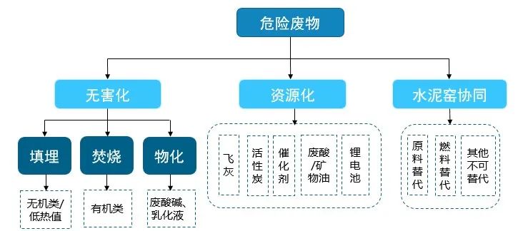 危險廢物的處理處置技術(shù)主要有資源化利用和無害化處置兩大類。無害化處置技術(shù)主要包括焚燒、物化和填埋三種方式,資源化利用技術(shù)則是將含有有效物質(zhì)等的高價值危廢,通過提純等方式將危廢加工成資源化產(chǎn)品進(jìn)行出售。此外,水泥窯協(xié)同處置近幾年逐步發(fā)展壯大,也成為無害化和資源化利用的有效補(bǔ)充。從幾種技術(shù)的特點來看,資源化利用技術(shù)是優(yōu)先技術(shù),焚燒處置是適用性最廣的技術(shù),填埋處置則是最終處置方式。
