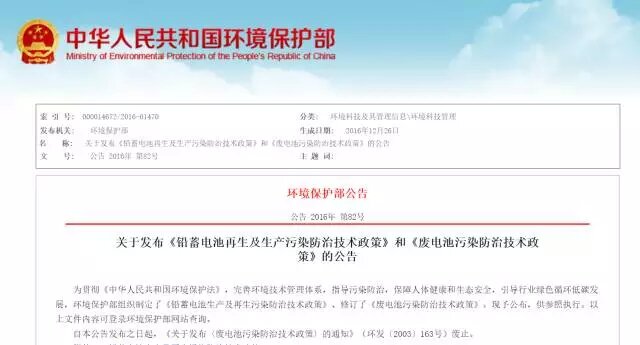 為貫徹《中華人民共和國環(huán)境保護(hù)法》,完善環(huán)境技術(shù)管理體系,指導(dǎo)污染防治,保障人體健康和生態(tài)安全,引導(dǎo)行業(yè)綠色循環(huán)低碳發(fā)展,環(huán)境保護(hù)部組織制定了《鉛蓄電池生產(chǎn)及再生污染防治技術(shù)政策》、修訂了《廢電池污染防治技術(shù)政策》?,F(xiàn)予公布,供參照執(zhí)行。以上文件內(nèi)容可登錄環(huán)境保護(hù)部網(wǎng)站查詢。