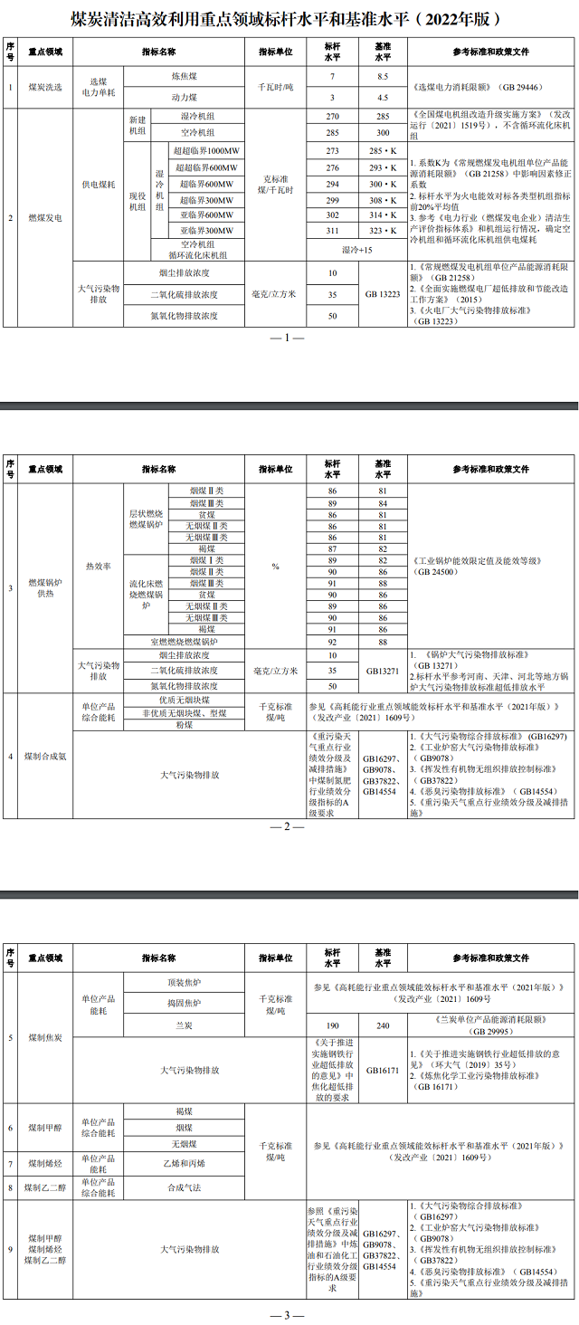 為貫徹落實黨中央、國務院決策部署,對標實現(xiàn)碳達峰、碳中和目標任務,推動煤炭清潔高效利用,促進煤炭消費轉(zhuǎn)型升級,現(xiàn)發(fā)布《煤炭清潔高效利用重點領域標桿水平和基準水平(2022年版)》,并就有關事項通知如下: