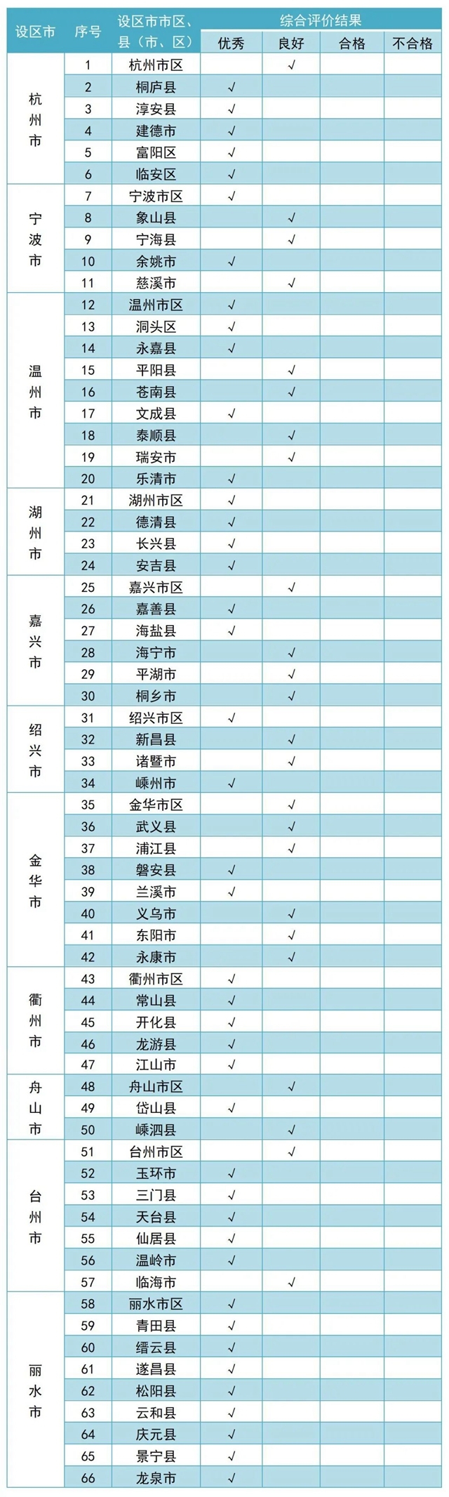 杭州市、湖州市、紹興市、金華市、衢州市、臺州市、麗水市等7個設(shè)區(qū)市考核結(jié)果為優(yōu)秀,寧波市、溫州市、嘉興市、舟山市等4個設(shè)區(qū)市考核結(jié)果為良好。
