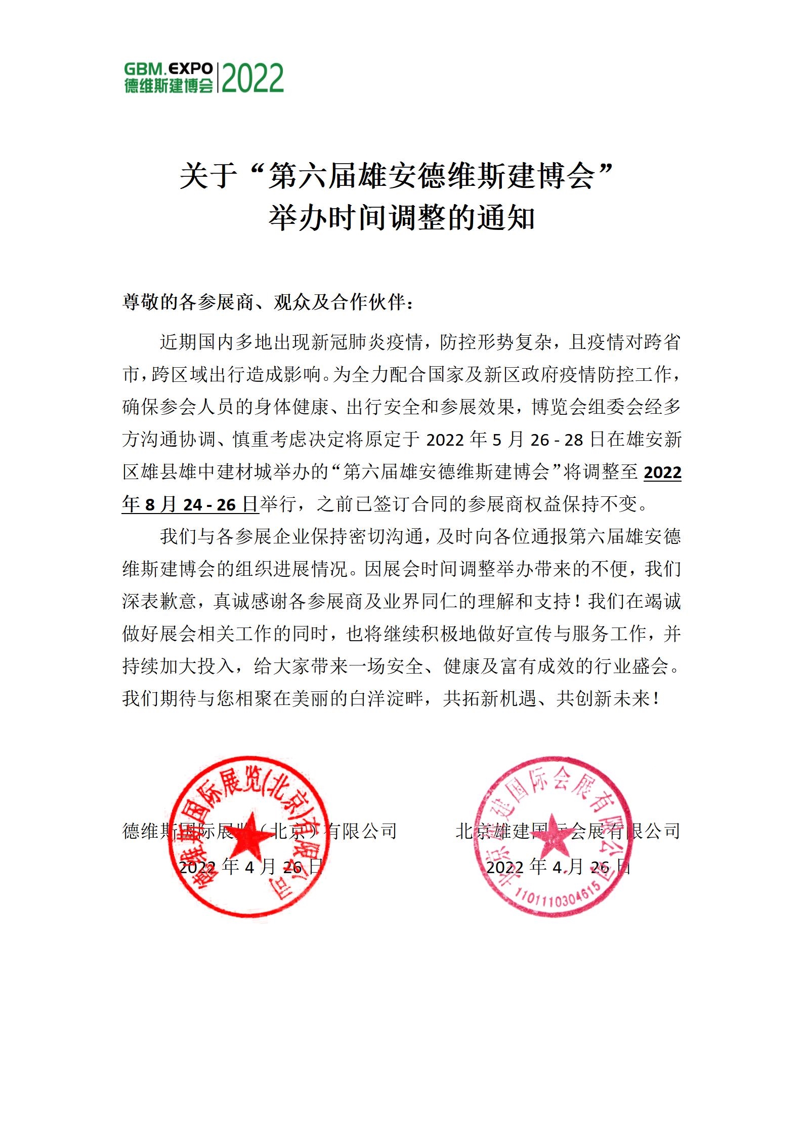 關(guān)于“第六屆雄安德維斯建博會(huì)”舉辦時(shí)間調(diào)整的通知