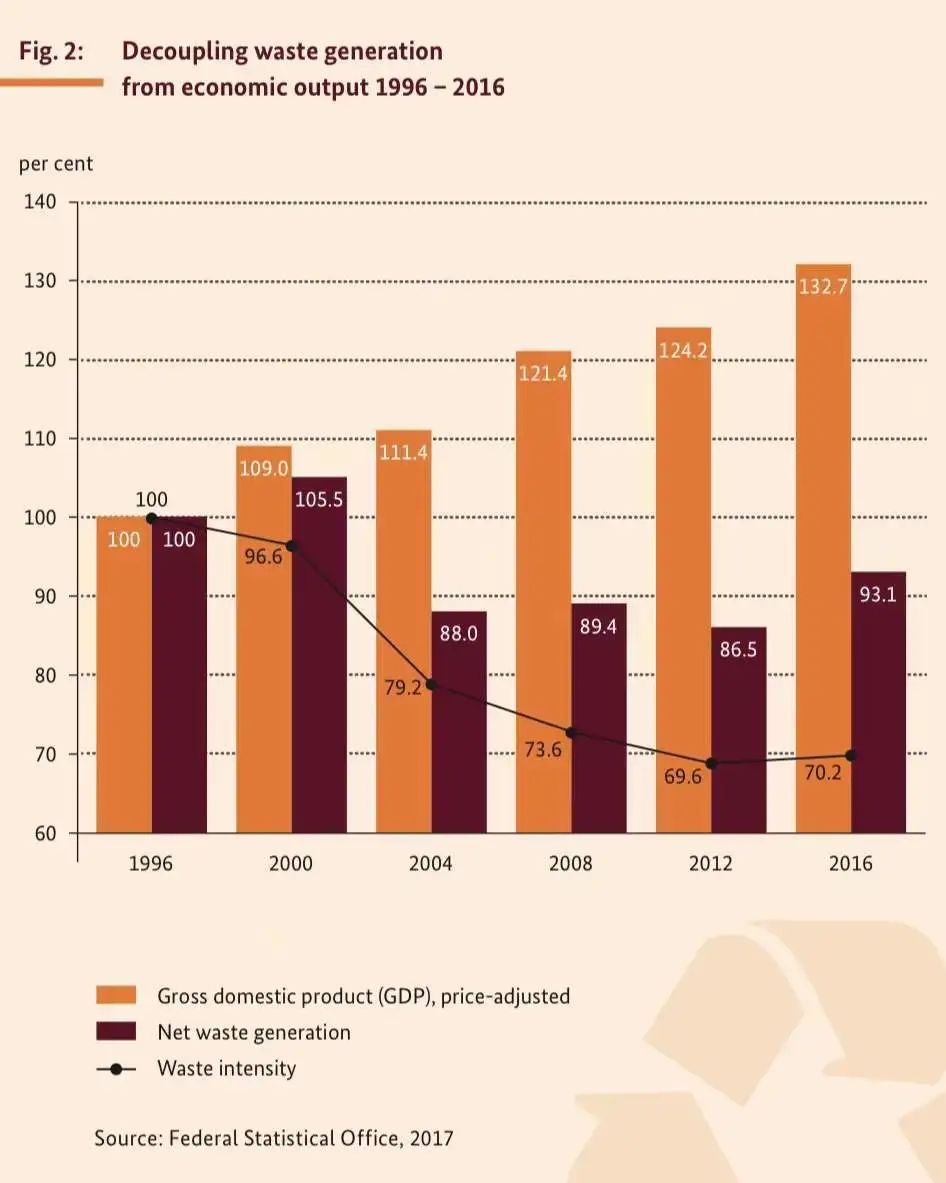 歐盟修訂的廢棄物法要求成員國在2025年達到55%的廢棄物回收率,2030年達到60%,2035年達到65%。同時,回收率的計算方法從基于投入改為面向產(chǎn)出。因此,德國廢棄物管理支持從源頭上對廢棄物進行分類。