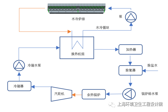 水冷爐排系統(tǒng)熱量也可以進(jìn)入鍋爐循環(huán)水系統(tǒng)用于驅(qū)動(dòng)汽輪機(jī)組詳見(jiàn)附圖7,從而實(shí)現(xiàn)熱量循環(huán)利用??傮w而言,水冷系統(tǒng)能夠帶走熱負(fù)荷2-3%,降低系統(tǒng)熱損失,增加焚燒廠(chǎng)發(fā)電量。