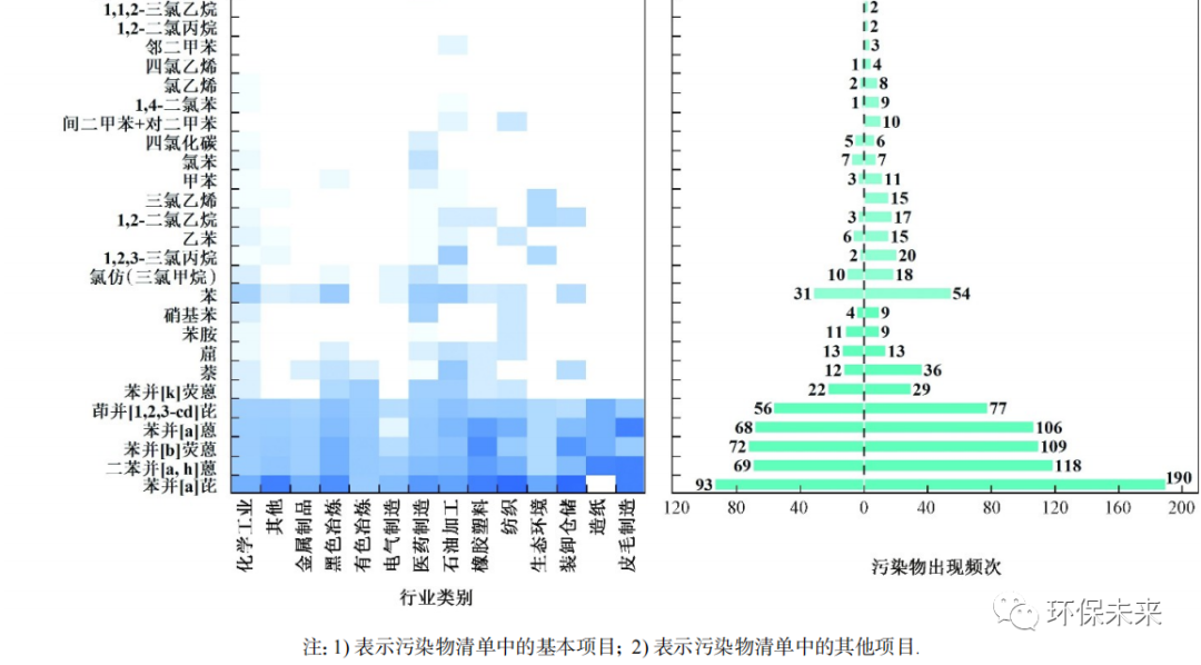 圖 2 不同行業(yè)污染場地特征污染物統(tǒng)計及 GB 36600—2018 實(shí)施前后污染場地修復(fù)/管控污染物出現(xiàn)頻次分析Fig.2 Statistics of characteristic pollutants of contaminated sites in different industries and analysis of the frequency ofpollutants in contaminated sites remediation/control before and after the implementation of GB 36600—2018